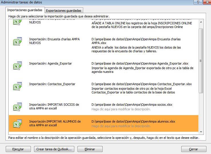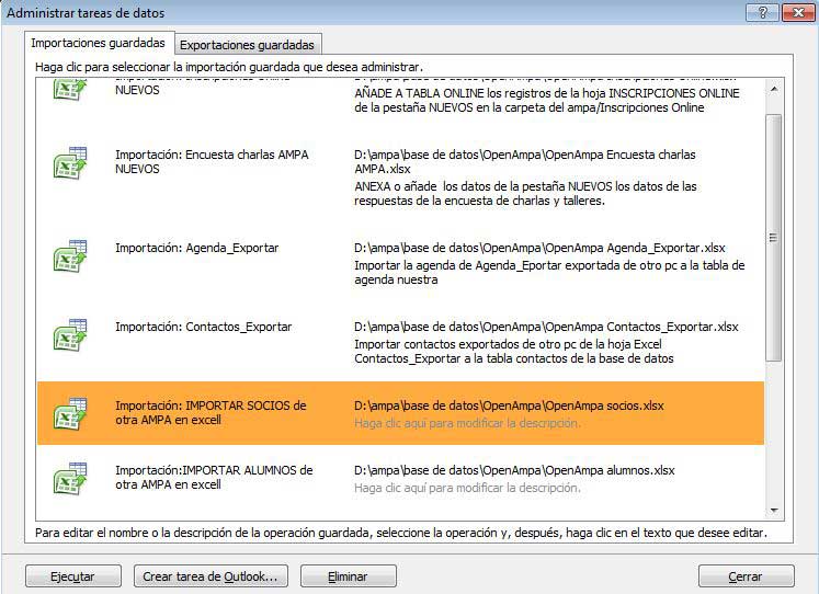 - IMPORTAR SOCIOS: Abrir la base de datos de OpenAmpa e ir a: Datos externos – Importaciones guardadas - Importación: IMPORTAR SOCIOS de otra AMPA en Excel (comprobar la ruta donde tenemos nuestro fichero “ OpenAmpa socios.xlxs” y pulsar “Ejecutar”. Importará todos los datos de tus socios.