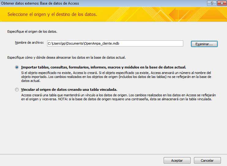 - Abrir la base de datos de OpenAmpa e ir a: Datos externos – Importar- Access – Marcar la opción “Importar tablas….” y seleccionar la base de datos donde están las tablas a importar de socios y de alumnos, pulsar “Aceptar”.