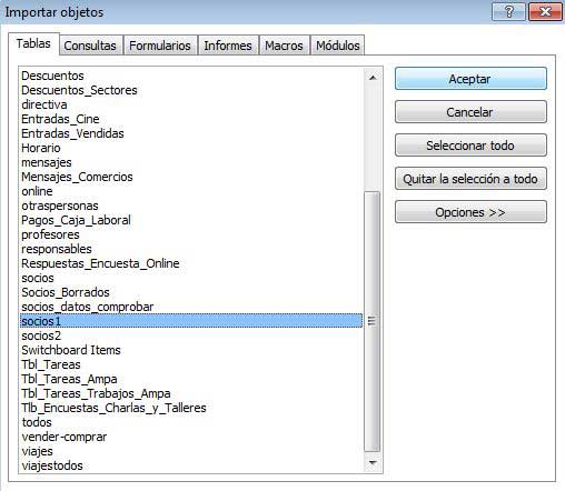- En Tablas seleccionar la tabla de socios o alumnos a importar (ej. socios1 y alumnos1) y dar “Aceptar”. Creará una nueva tabla con la tabla que hemos importado. Hacerlo con los socios y los alumnos.