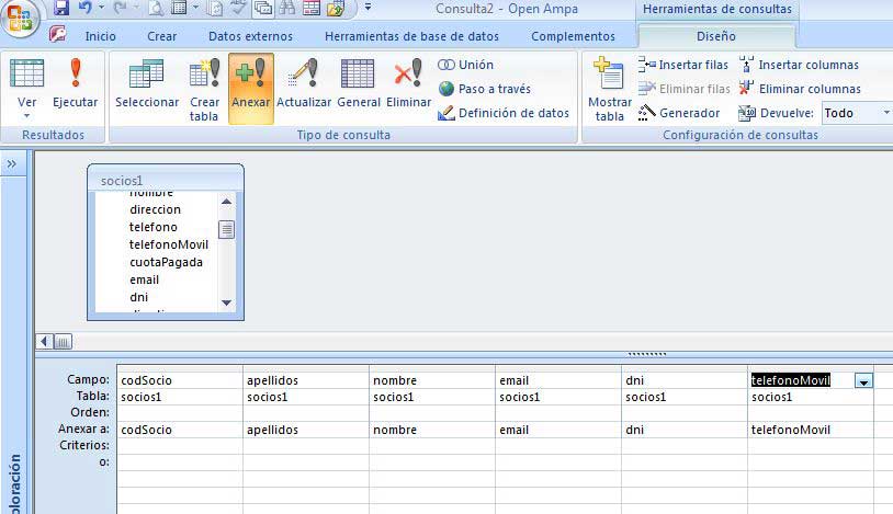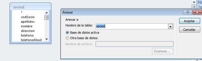 - Seleccionar Anexar y seleccionar la tabla a anexar a socios o alumnos y Aceptar.