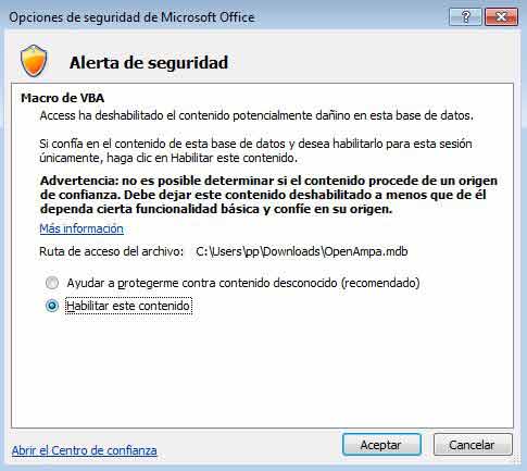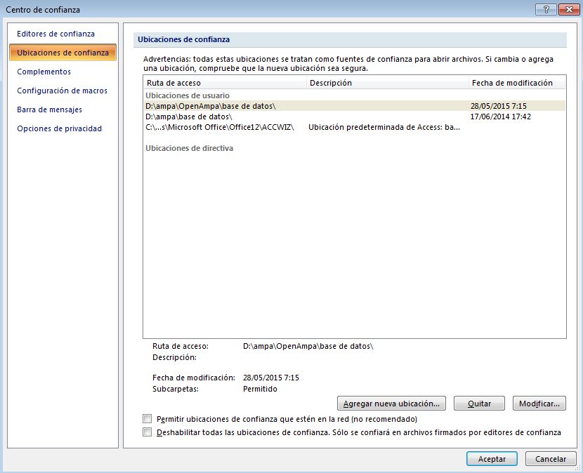 - Pero mejor pulsar “Abrir el centro de confianza” y en “Ubicaciones de confianza” seleccionar “Agregar nueva ubicación” y añadir la carpeta donde tenemos la base de datos para que no pregunte nunca más.